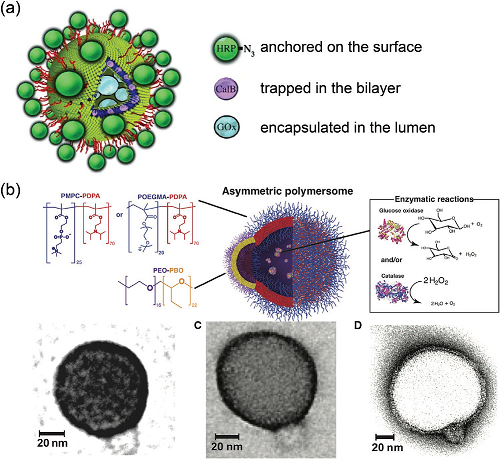 Reproduced with permissions.[40] Copyright 2009, Wiley-VCH. b) Schematic representation and TEM images of a chemotactic polymersome using a