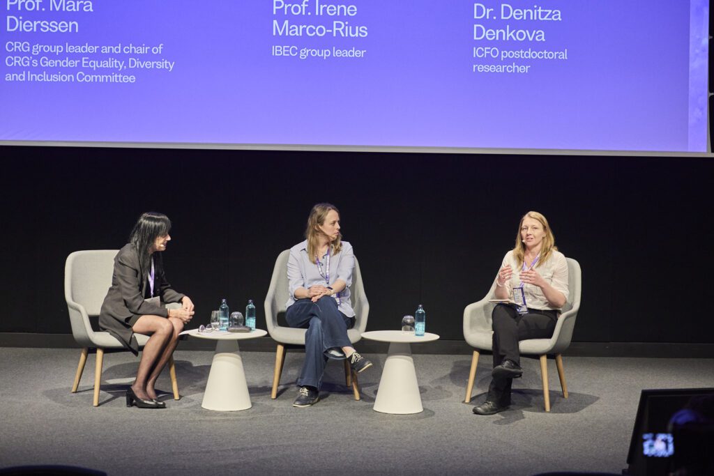 El BIST Forum también abordó la brecha de género que aún persiste en los puestos de liderazgo dentro de las disciplinas STEM (ciencia, tecnología, ingeniería y matemáticas). En una mesa redonda en la que participaron dos científicas que dirigen grupos de investigación —Mara Dierssen (CRG) e Irene Marco-Rius (IBEC)—, junto con Denitza Denkova, actualmente investigadora posdoctoral en el ICFO y que pronto dirigirá su propio grupo, se debatieron los factores estructurales que explican la disminución gradual de la proporción de mujeres a medida que avanzan en sus carreras científicas, un fenómeno conocido como «leaky pipeline».