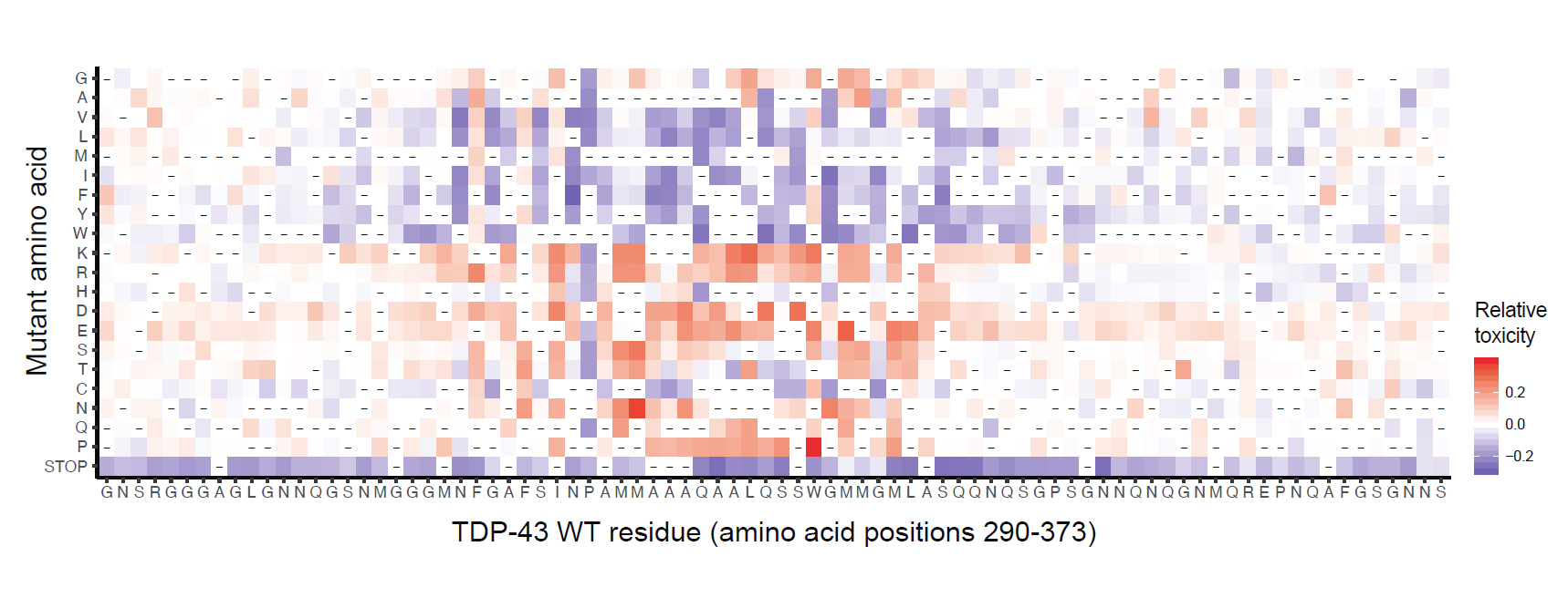 Map of the effect of mutations on toxicity of the TDP-43 Prion-like Domain.